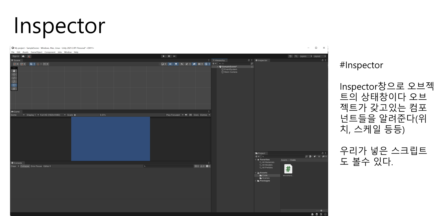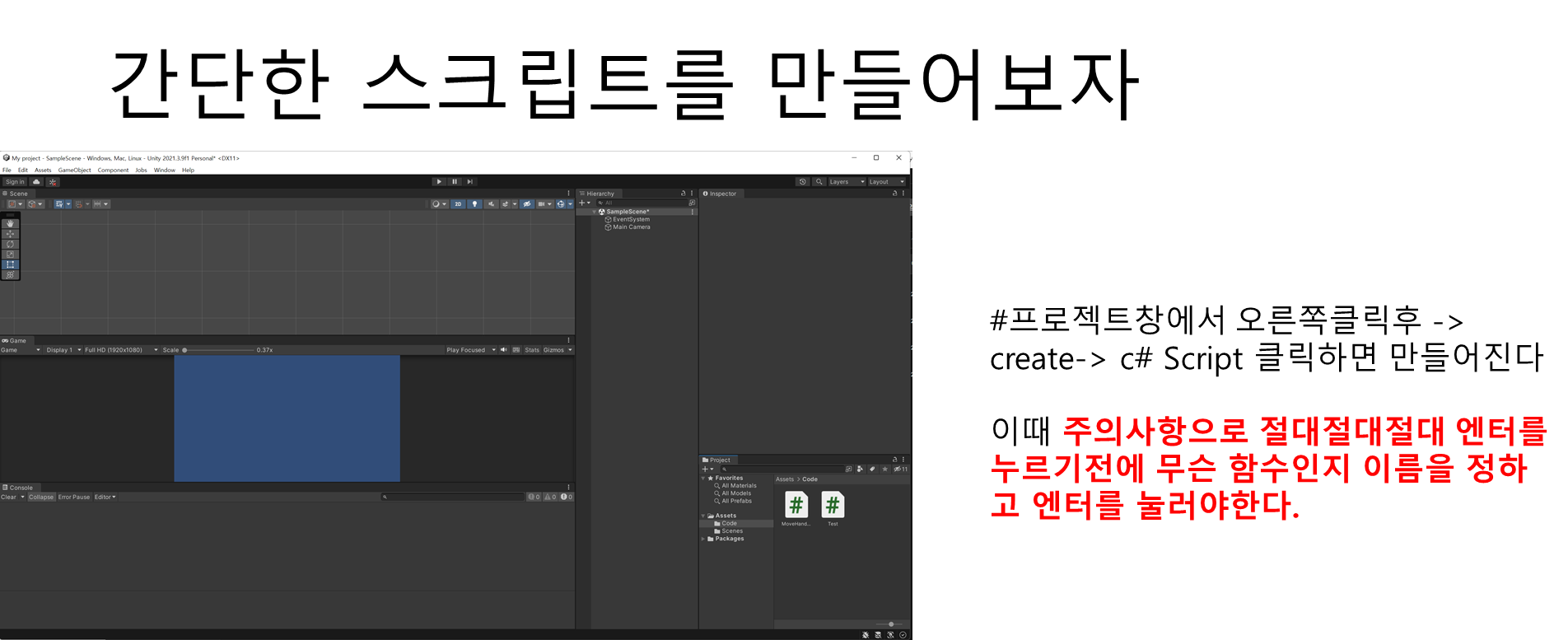 씬과 게임창을 동시에 보며 오류사항 발생시 아래 콘솔창에서 확인하기 위해 세개의 창을 한번에 두었습니다.