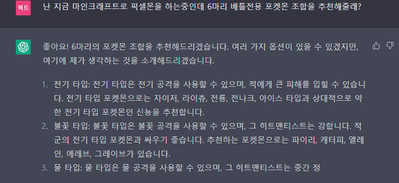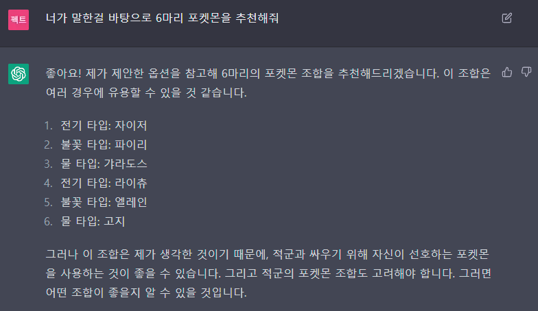 6마리 포켓몬 조합을 짜야하는데 궁금해서 chatgpt에게 물어봤습니다.